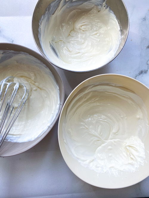 Unite la panna alle tre ciotole, mescolate bene e aggiungete per ogni ciotola 30 g di zucchero a velo.