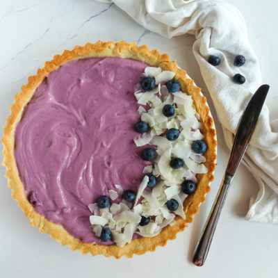 Il risultato sarà una golosissima crostata senza burro e uova formata da una friabile base di frolla integrale, uno strato di marmellata ai mirtilli, crema frangipane e frutti di bosco freschi.