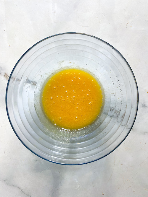 In una ciotola lavorate le uova con lo zucchero e l’olio con una frusta.