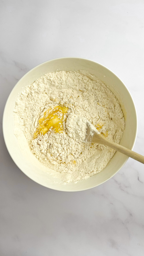 Unite la farina e lavorate prima con un cucchiaio di legno e poi con le mani fino ad ottenere un impasto compatto.