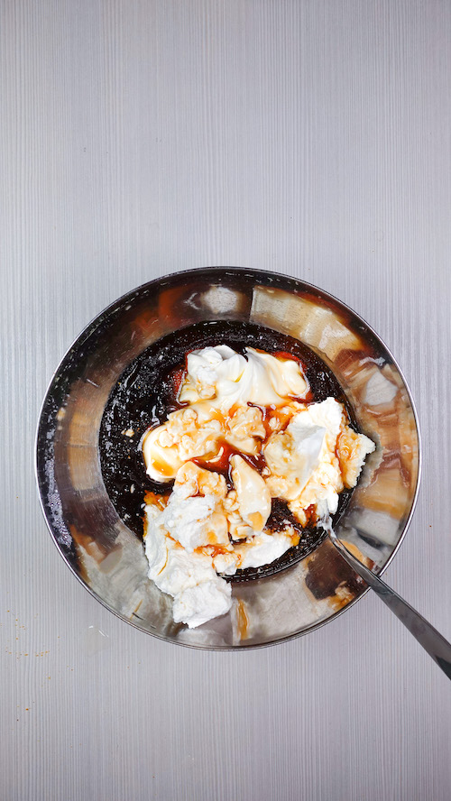 Lavorate il formaggio spalmabile con la ricotta e lo sciroppo d’acero.